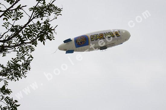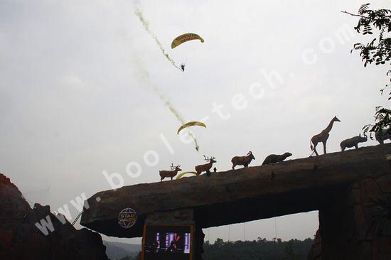 無人機(jī)退場后,一輛熱氣球飛艇和一組背著動力傘的“星球戰(zhàn)士”隨之飛抵現(xiàn)場,而同時,另一組“星球戰(zhàn)士”手拉繩索從天而降。