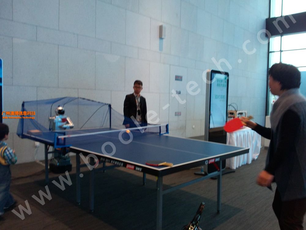 游客正在與機器人打乒乓球