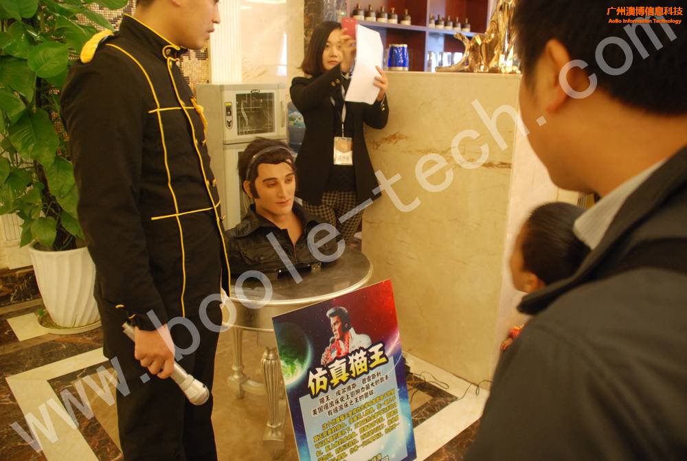 按照已故天王巨星“貓王”外表設計,1:1還原,無論是發型、臉型、皮膚,甚至是衣服也頗有當代歌星的特征!高仿真機器人“貓王”主要有兩大功能:唱歌,說話。通過遙控器控制,可讓機器人唱歌,期間機器人頭部會擺動,嘴巴會張合,甚至連眼睛、眉毛、嘴角等細節動作也能突顯出來!