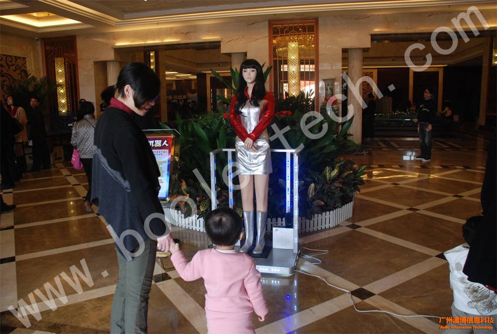 按照標準1.7米人體比例設計,擁有靚麗外表,當游客經過的時候,還會鞠躬問候,加上絢麗的LED站臺,讓人眼前一亮。有興趣的朋友還可以拿起麥克風與美女迎賓機器人對話呢!