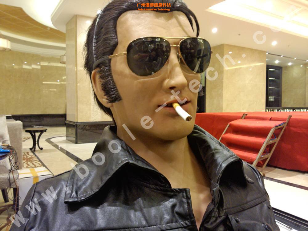 這個智能防真機器人更是將仿生學及智能電子控制真正完美的結合,很難另人想像,在一副幾乎可以亂真的面孔下,五官居然全都可以活動自如,配上他的成名曲,跟著音樂節拍,眼睛忽閃忽閃,時而注視你,時而望向遠方,挑挑眉毛,搖頭晃腦,仿佛一代巨星復活。